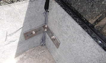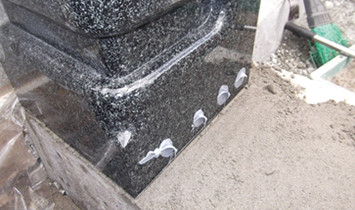 次に石積み工事では、石と石を組み合わせるときの補強用に、錆びないステンレス製の金具を使って固定して、石材用の接着剤(吸震性もあります)で接着した後に、つなぎ目を防水性の高いシーリング剤でふさいでいます。 このように、見えない部分まで念を入れた妥協のないお墓づくりをしています。