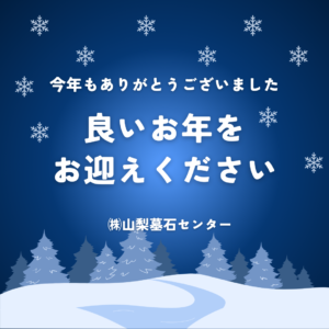 今年もありがとうございました 2025年12月25日 山梨墓石センターの本年の営業は本日(12/26)までと させていただきます。 今年一年皆様には大変お世話になり、心より お礼申し上げます。 年明けは1月7日(水)より通常営業いたします。 来年もどうぞよろしくお願いいたします。