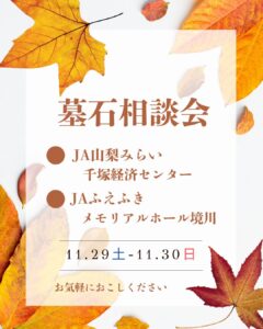 墓石なんでも相談会のお知らせです。 11月29日(土)・30日(日) ●JA山梨みらい千塚経済センター ●JAふえふきメモリアルホール境川 🕒9:00~15:00 お近くの方はぜひ、お越しく […]