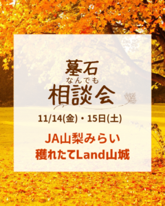 墓石なんでも相談会のお知らせです。 11月14日(金)・15日(土) JA山梨みらい穫れたてLand山城にて行います。 お近くの方はぜひ、お越しください。 お待ちしております。