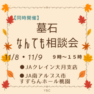 墓石なんでも相談会のお知らせです。 今回は2か所同時開催です。 ●JAクレイン大月支店《山梨県大月市初狩町下初狩735-6》 ●JA南アルプス市すずらんホール桃園《山梨県南アルプス市桃園1036-6》 11月8日(土)・ […]
