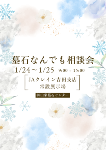 今週も墓石相談会開催いたします。 場所:JAクレイン吉田支店 日時:2026.1.24(土)~1.25(日) 大寒波がきておりますが、ぜひお越しください!