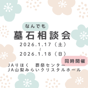今年初の墓石相談会を開催します。 ・JAりほく葬祭センター ・JA山梨みらいクリスタルホール 日時:2026.1.17(土)~1.18(日) 9時~15時 お近くの会場にお越しください。 皆様のお越しを心よりお待ちしてお […]