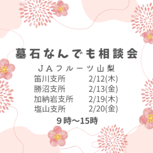 墓石なんでも相談会のお知らせです JAフルーツ山梨管内の購買課4か所で開催します ・笛川支所 2/12(木) ・勝沼支所 2/13(金) ・加納岩支所 2/19(木) ・塩山支所 2/20(金) 9:00~ […]