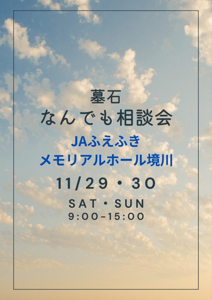 JAふえふき メモリアルホール境川 2025年11月29日(土) 〜 2025年11月30日(日) 墓石なんでも相談会のお知らせです ●JAふえふきメモリアルホール境川にて ●11月29日(土)/30日(日) 9:00~15:00 お墓に関すること、なんでもご相談ください お待ちしております お墓に関するお問合せ・ご相談はこちらからどうぞ 0120-37-1441受付時間 9:00~18:00 メールはこちら 開催場所
