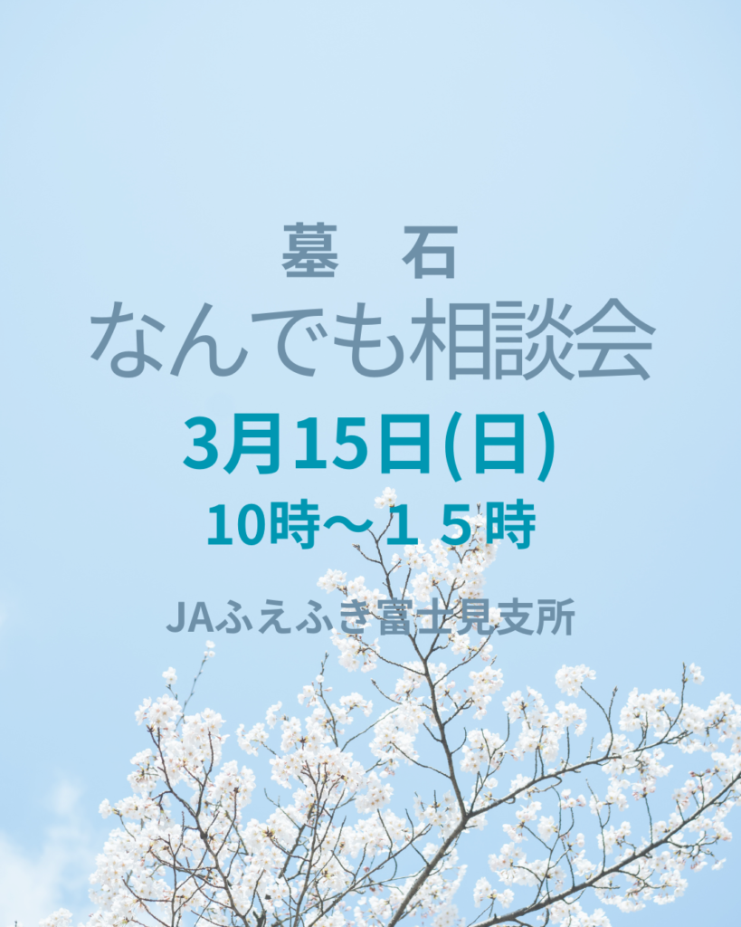 JAふえふき富士見支所 2026年03月15日(日) 〜 2026年3月15日(日) 墓石なんでも相談会のお知らせです。 日時 3月15日(日) 10時~15時. 場所 JAふえふき富士見支所. 皆様のお越しを心よりお待ちしております☺ お墓に関するお問合せ・ご相談はこちらからどうぞ 0120-37-1441受付時間 9:00~18:00 メールはこちら