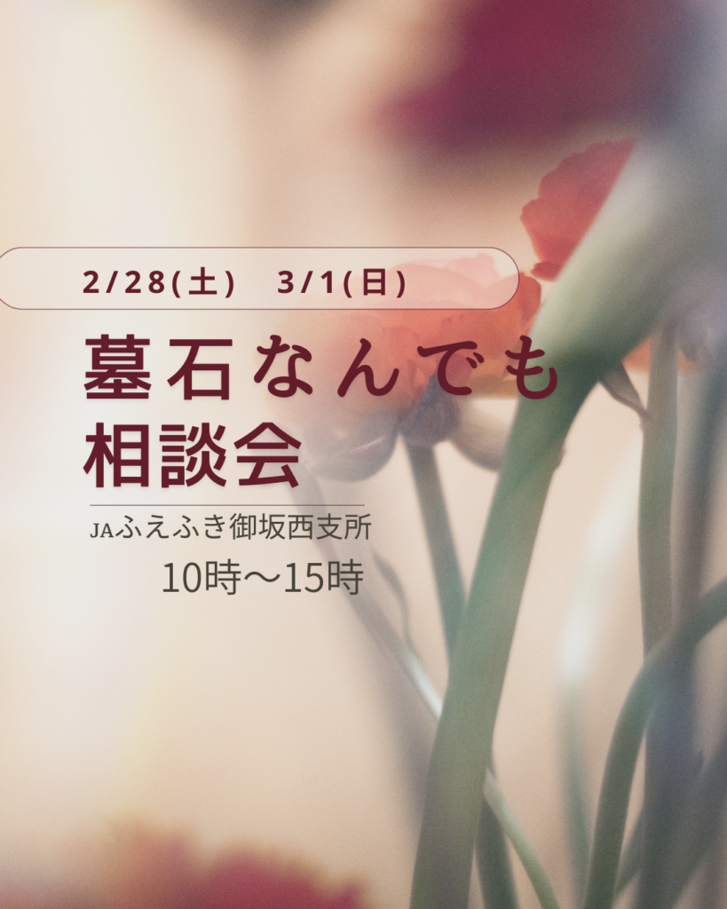 JAふえふき御坂西支所 2026年2月28日(土) 〜 2026年3月1日(日) 墓石なんでも相談会のお知らせです。 日時:2/28(土).3/1(日) 10時~15時 場所:JAふえふき御坂西支所(笛吹市御坂町夏目原620) 皆様のお越しを心よりお待ちしております。 お墓に関するお問合せ・ご相談はこちらからどうぞ 0120-37-1441受付時間 9:00~18:00 メールはこちら 開催場所 JA南アルプス市 ふえふき フルーツ山梨同時開催 JAフルーツ山梨 一覧にもどる