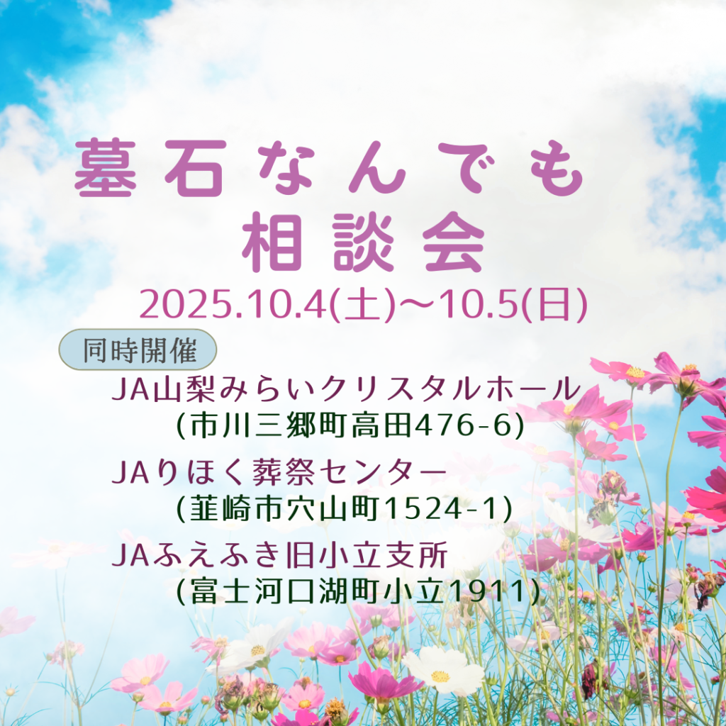 JA南アルプス市クリスタルホール・JAりほく葬祭センター・JAふえふき旧小立支所 2025年10月4日(土) 〜 2025年10月5日(日) 墓石なんでも相談会のお知らせ ・JA山梨みらいクリスタルホール (市川三郷町高田476-6) ・JAりほく葬祭センター (韮崎市穴山町1524-1) ・JAふえふき旧小立支所 (富士河口湖町小立1911) .2025.10.4(土)~10.5(日) .9:00~15:00 3展示場同時開催です お近くの展示場にお越しください(^^)/ お墓に関するお問合せ・ご相談はこちらからどうぞ 0120-37-1441受付時間 9:00~18:00 メールはこちら