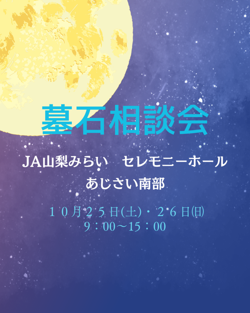 JA山梨みらい あじさい南部 2025年10月25日(土) 〜 2025年10月26日(日) 墓石相談会のお知らせです JA山梨みらい セレモニーホールあじさい南部にて 墓石なんでも相談会を開催いたします。 石塔の設置だけでなく、クリーニングやリフォーム、または墓じまいに関しても ご相談に応じます。 お気軽にお越しくださいませ☺ 日時:2025年10月25日㈯・26日㈰ 9時~15時 場所:JA山梨みらい セレモニーホールあじさい南部 お墓に関するお問合せ・ご相談はこちらからどうぞ 0120-37-1441受付時間 9:00~18:00 メールはこちら 開催場所